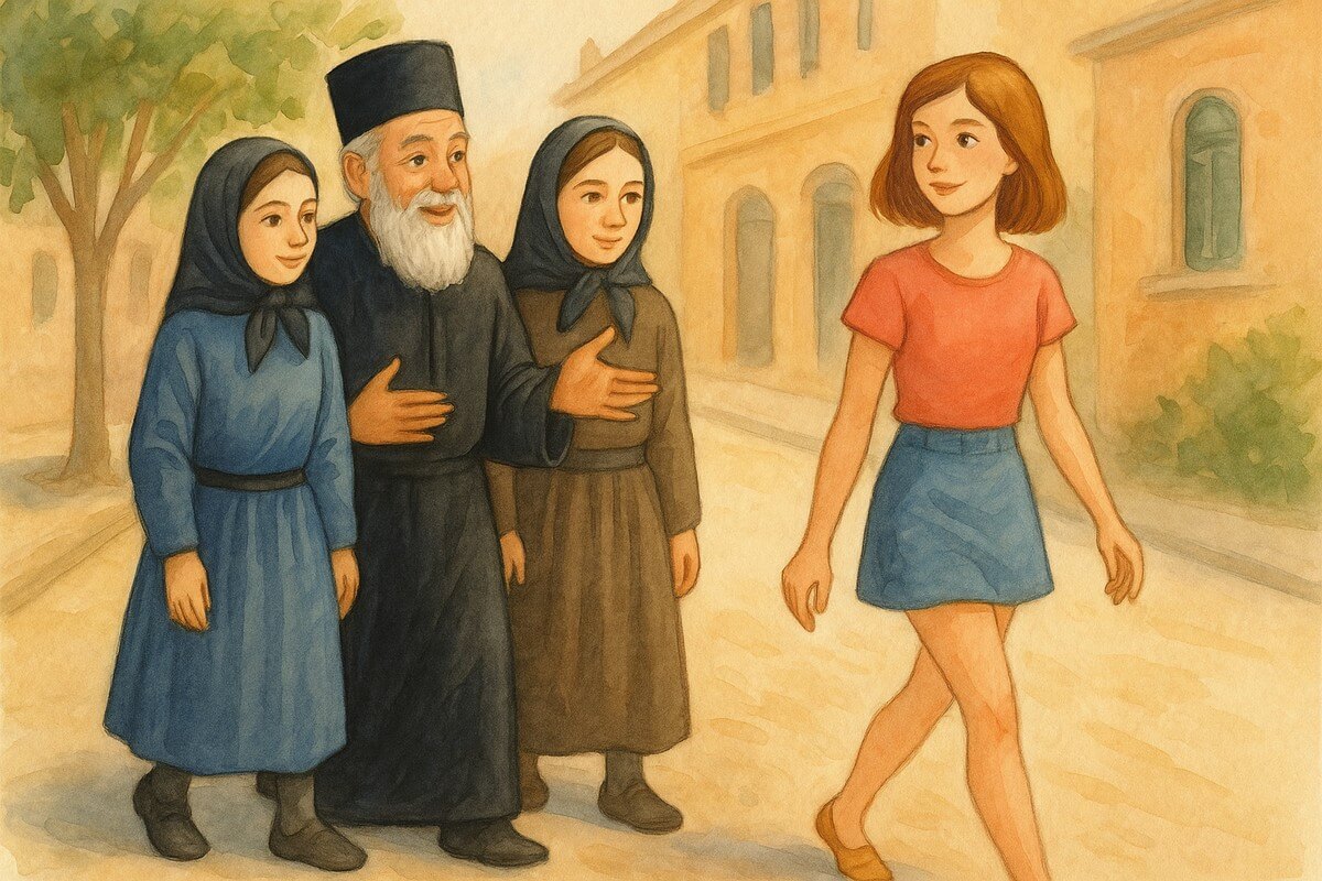 Во пресрет им доаѓаше девојче кое изгледаше многу провокативно. Носеше многу кратко здолниште кое тогаш беше во мода. Здогледувајќи ја, Старецот ги праша своите духовни ќерки: