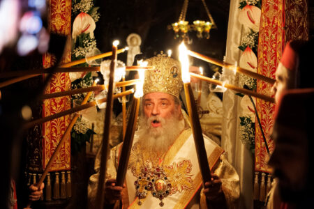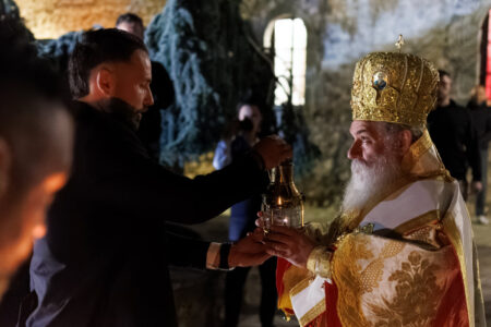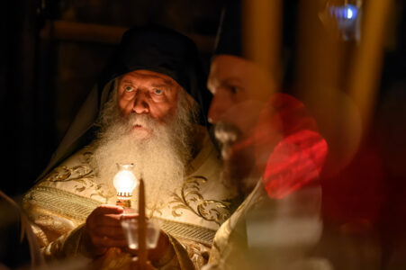 Dhe ja, këtë natë Bigori u ndriçua me dritën e Ditës së Pa Mbrëmje. Jo me dritë elektrike, jo me reflektorë, por me atë shkëlqim të lashtë, misterioz, të papërshkrueshëm, që e bart çdo qiri pashkor i ndezur nga Zjarri i Bekuar i Jerusalemit, i cili edhe këtë vit, me bekimin e Atit tonë të dashur, Episkopit të Antanisë z. Parteni, arriti në Manastirin tonë. Dritë nga Drita, Zjarr nga Zjarri, Krishti nga Ati.