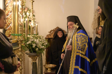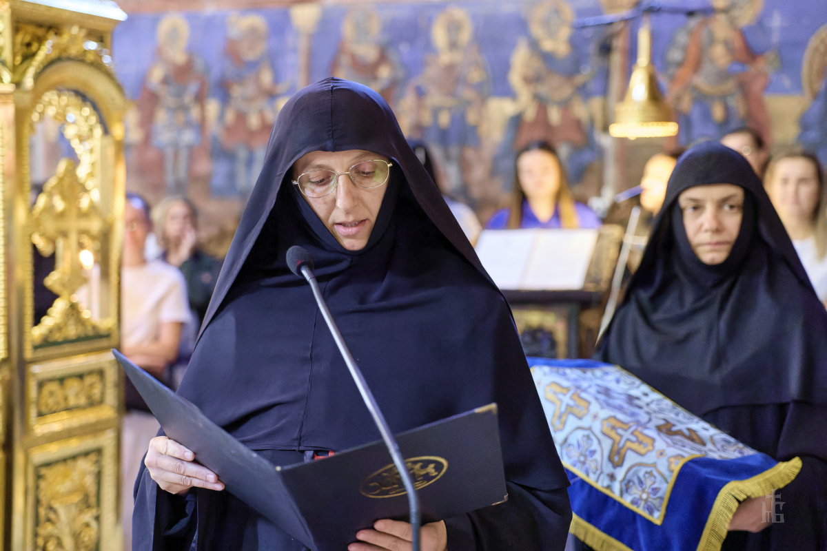Посебна духовна радост и умиление причини благодарственото обраќање на старешинката на манастирот Пречиста, монахињата Харитина, која, во име на целото сестринство, со особена почит му подари на нашиот Старец рачно изработен крст за благословување – како знак на благодарност и љубов за неговата несебична грижа и родителска љубов. Повод за овој уникатен и значаен дар беше првото големо торжествено светогорско бдение за празникот на Успението, отслужено токму во нивната Пречистанска Обител – едно духовно собитие кое претставува историски и благословен почеток за нова епоха од животот на овој Богородичен дом. Во своето срдечно, но достоинствено и смирено обраќање, сестра Харитина му ги упати на својот духовен отец следниве трогателни зборови: