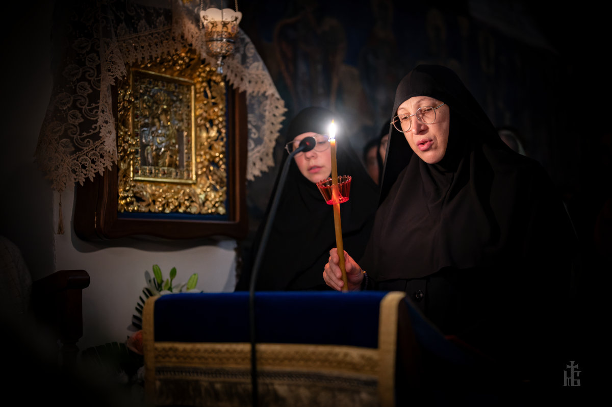 Посебна духовна радост и умиление причини благодарственото обраќање на старешинката на манастирот Пречиста, монахињата Харитина, која, во име на целото сестринство, со особена почит му подари на нашиот Старец рачно изработен крст за благословување – како знак на благодарност и љубов за неговата несебична грижа и родителска љубов. Повод за овој уникатен и значаен дар беше првото големо торжествено светогорско бдение за празникот на Успението, отслужено токму во нивната Пречистанска Обител – едно духовно собитие кое претставува историски и благословен почеток за нова епоха од животот на овој Богородичен дом. Во своето срдечно, но достоинствено и смирено обраќање, сестра Харитина му ги упати на својот духовен отец следниве трогателни зборови: