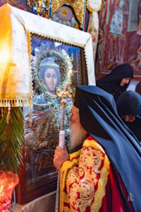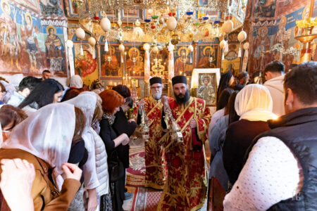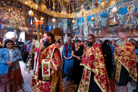 Денеска, пак, во продолжение на славеничката радост, беше отслужена празнична Утрена, а потоа и Божествената Литургија, со која чиноначалствуваше Преосвештениот Антаниски г. Партениј, во сослужение со свештенослужителите од бигорското братство. Хорот „Митрополит Козма Пречистански“ со своето благозвучно пеење уште повеќе ја возвиши богослужбената радост. Присуството на многуброен народ, обединет во молитвата и во благодарноста кон светиот Победоносец, го засили благодатното присуство на Светиот на празникот. За тоа присуство говореше и Старецот во својата вдахновена проповед по читањето на Светото Евангелие.