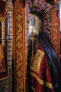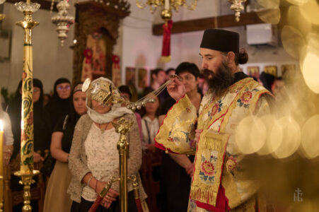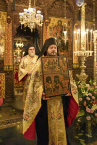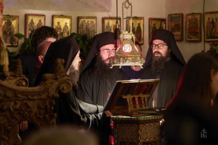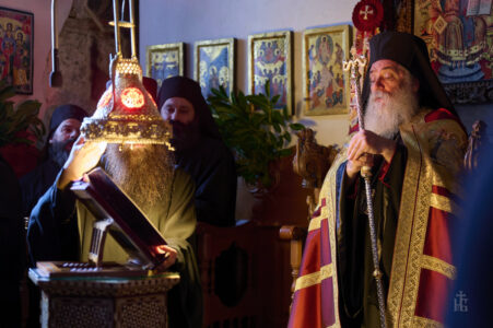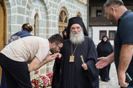 На крајот од свештеното богослужение, нашиот почитуван митрополит г. Георгиј се обрати до верниците со свое вдахновено слово за маченичкиот подвиг на свети Јован Крстител. Потоа, во свечениот манастирски синодикон, тој срдечно му се заблагодари на нашиот старец и на братството за топлиот манастирски пречек, истакнувајќи ги своето задоволство и чест што присуствувал и зел учество во една ваква манастирска слава. Воедно, тој му го честиташе триесетгодишниот јубилеј на дедо Партениј, нарекувајќи го прав владика, духовен татко на монаси, градител на материјални, но пред сѐ, на духовни светињи. Притоа, тој му подари на нашиот игумен архиерејски енклопион со иконата на светото Благовештение. Од своја страна, пак, старецот му се заблагодари на митрополитот за укажаната чест, подарувајќи му од името на нашата монашка заедница комплет архиерејски одежди и митра, специјално подготвени за него од рацете на нашите браќа монаси и сестри монахињи – истите со кои владиката Георгиј богослужеше денес.
