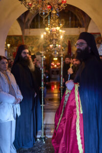 Со оваа единствена по духовна убавина Вечерна богослужба претстоеше нашиот сакан Старец, Неговото преосвештенство епископот Антаниски г. Партениј, чијшто глас, навикнат да се моли повеќе одошто да зборува, ги патеводеше душите кон она место каде што човекот застанува пред Бога со празни раце, без оправдувања, без маски, без ништо друго, освен со својата жед за обновување. На крајот од Вечерната, Старецот го означи почетокот на великопосното богослужение со древната и умилна молитва на свети Ефрем Сирин – таа молитва која, како никоја друга, го разоткрива она најсуштинското во човечкото срце: „Господи и Владико на животот мој, дух на леност, безволност, властољубие и празнословие не давај ми. Дух, пак, на целомудрие, смиреномудрие, трпение и љубов дарувај ми, на Твојот слуга.“ Со земните поклони и со молитвите за благослов на почетокот на постот, нешто се промени во воздухот на храмот и уште повеќе – во срцата на верните. Како да падна превезот меѓу празничното и подвижничкото, и сите почувствуваа дека стапнуваат на друга почва – света почва, построга, но и понежна, зашто Великиот пост не е казна, туку лекување; не е оптоварување, туку ослободување.
