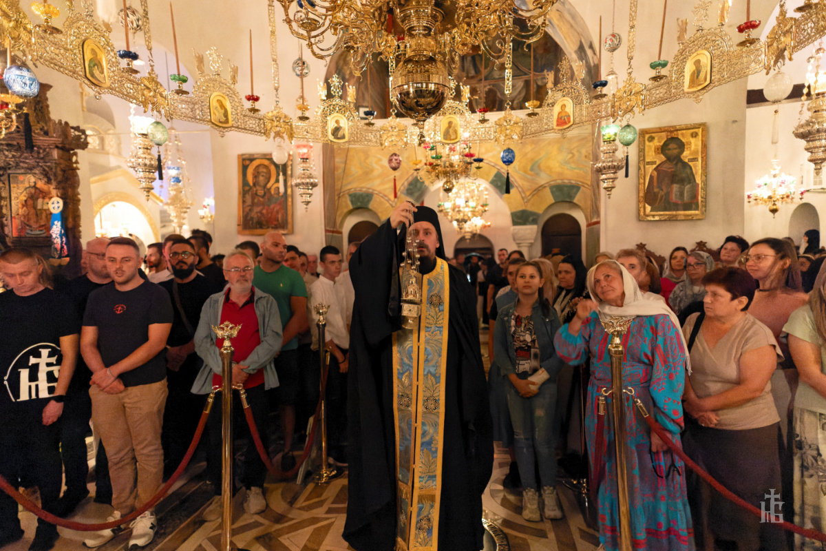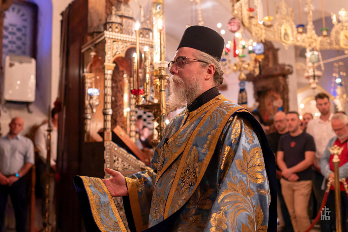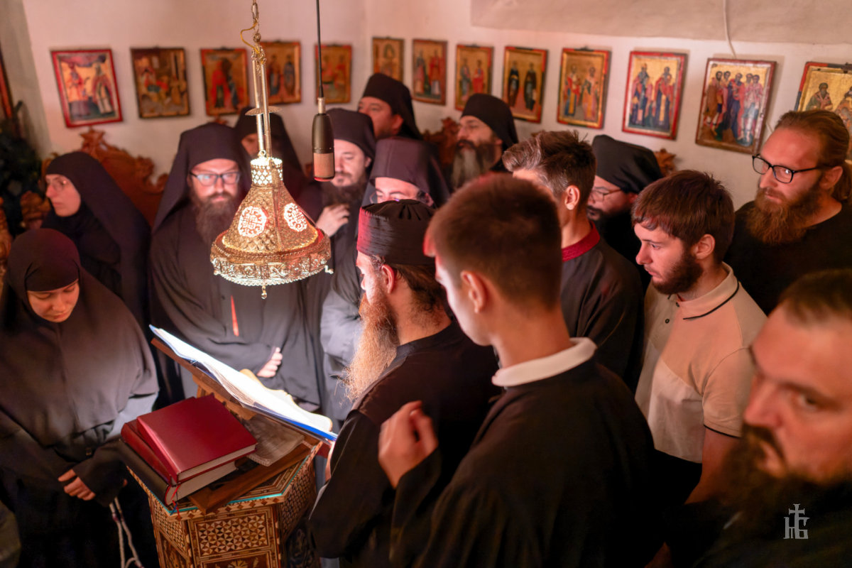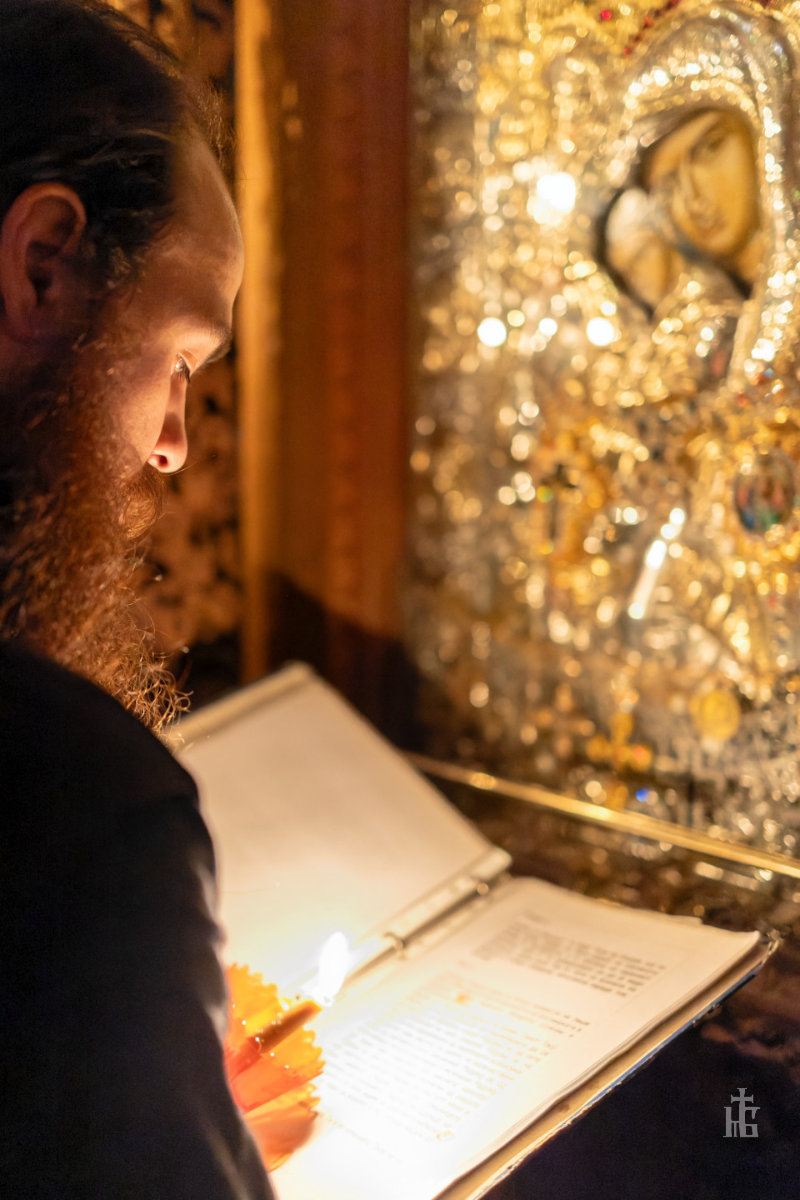 Нашата Свештена Обител на Чесниот Претеча најторжествено, со љубов и посветеност го пречека и прослави овој христијански и црковен празник, извршувајќи сеноќно молитвено и песнено бдение на кое претстоеше нашиот возљубен Старец и Игумен, Епископот Антаниски г. Партениј. Со умиление се изврши традиционалната литанија и опход околу храмот со плаштаницата на Пресвета Богородица и се испеаја погребните статии од страна на целиот верен народ кој го преполнуваше Бигорскиот храм. А пак, круната на празнувањето – Светата и Божествена Евхаристија беше вистински влез во вечниот и незаоден осми ден на Царството на Отецот и Синот и Светиот Дух. Нашиот Старец, личноста која нѐ соединува со реалноста на вечноста, нѐ напои со созерцателни сили и благодат преку вдахновеното и пофално слово за Пресветата Владичица и Богомајката која послужи во остварувањето на Божјата промисла за спасението на светот.