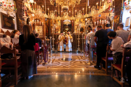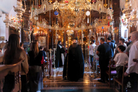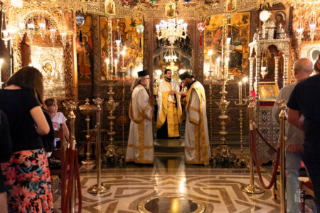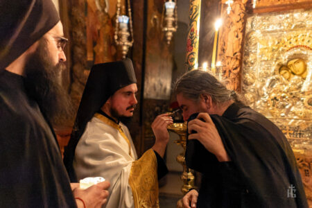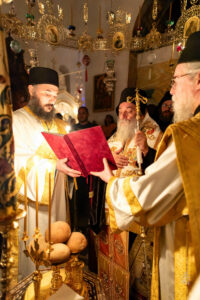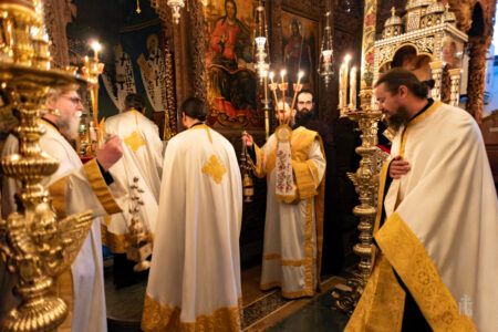А денеска, на денот на самото торжество, светата Божествена Евхаристија беше венецот на апостолската слава, принесена од нашиот Старец, во сослужение со браќата свештенослужители.