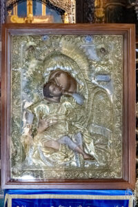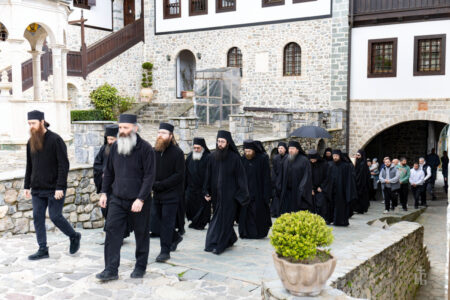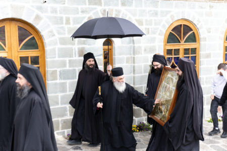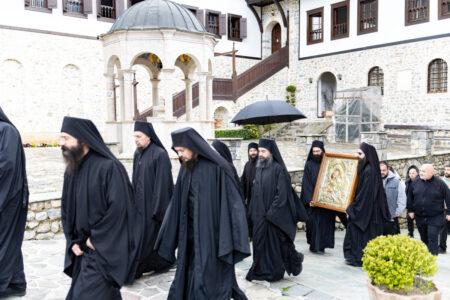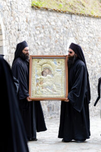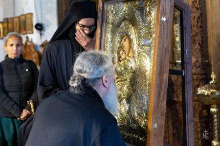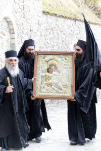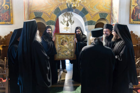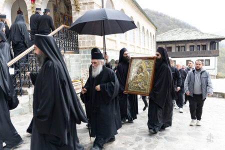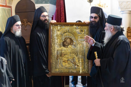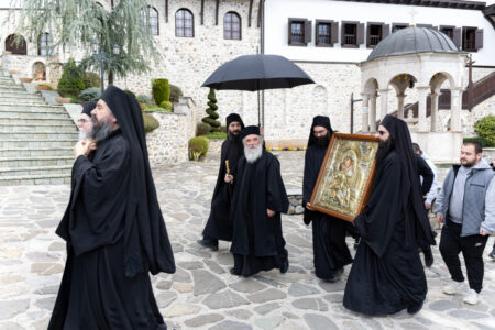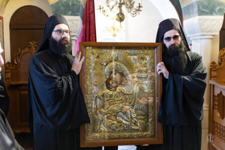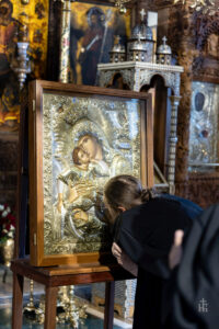 Имено, денеска во нашата Свештена Бигорска Обител пристигна верна изобразба на чудотворната икона на Пресвета Богородица Гликофилуса (Слаткољубива, или Умиление), којашто се чува во светогорскиот Манастир Филотеј. Иконата од Солун ја донесе лично нашиот Старец, Епископот Антаниски г. Партениј, и таа беше пречекана со срдечна радост, со тропари и воспеви посветени на Царицата Небесна. Нашиот возљубен Старец, заедно со монашкото братство и притекнатите верници, со неизмерна радост и благоговение ѝ приредија свечен пречек на оваа свештена икона, чијашто тивка мајчинска милост и сладост го исполнуваше воздухот во Бигорски и се чувствуваше длабоко во душите на сите.