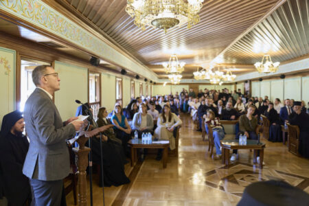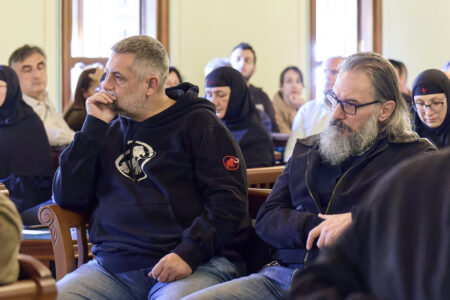Професорот Александар, мое долгогодишно духовно чедо кое го познавам уште од неговата младост, не говореше како гостин, туку како човек кој со години доаѓа тука, го познава духот на ова братство, живее заедно со нас, го чувствува братството како свое, учествува во литургискиот живот манастирот, и заедно со своето семејство живее вистински црковен живот. Затоа, кога размислувавме кому да му го довериме зборот на промоцијата, решивме дека токму тој е најпогодната личност. Затоа што може со чисто срце и искрена совест да посведочи за она што овде се гради, не со раце, туку, пред сѐ, со молитви, со љубов, со солзи.