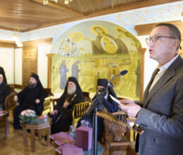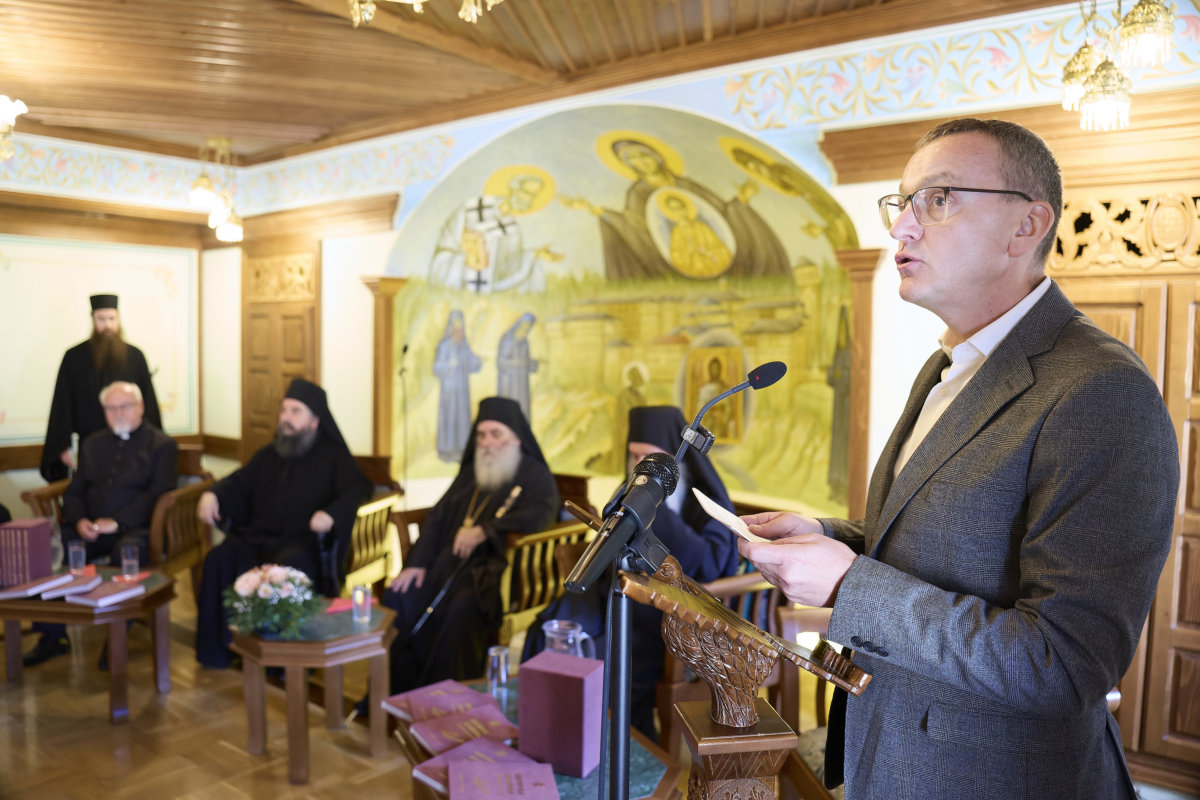 Професорот Александар, мое долгогодишно духовно чедо кое го познавам уште од неговата младост, не говореше како гостин, туку како човек кој со години доаѓа тука, го познава духот на ова братство, живее заедно со нас, го чувствува братството како свое, учествува во литургискиот живот манастирот, и заедно со своето семејство живее вистински црковен живот. Затоа, кога размислувавме кому да му го довериме зборот на промоцијата, решивме дека токму тој е најпогодната личност. Затоа што може со чисто срце и искрена совест да посведочи за она што овде се гради, не со раце, туку, пред сѐ, со молитви, со љубов, со солзи.